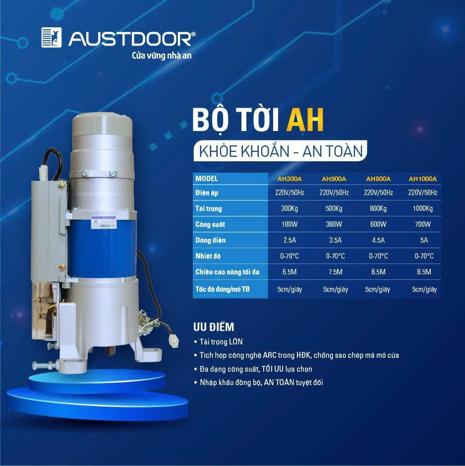Motor Austdoor AH với công nghệ hàng đầu về bảo mật, chống sao chép mã mở cửa, hệ thống tự dừng đảo chiều, hệ thống còi báo động, hệ thống chống sổ lô hư cửa.