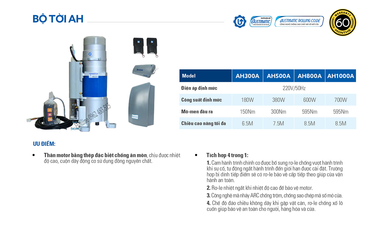 Motor Austdoor AH với công nghệ hàng đầu về bảo mật, chống sao chép mã mở cửa, hệ thống tự dừng đảo chiều, hệ thống còi báo động, hệ thống chống sổ lô hư cửa.